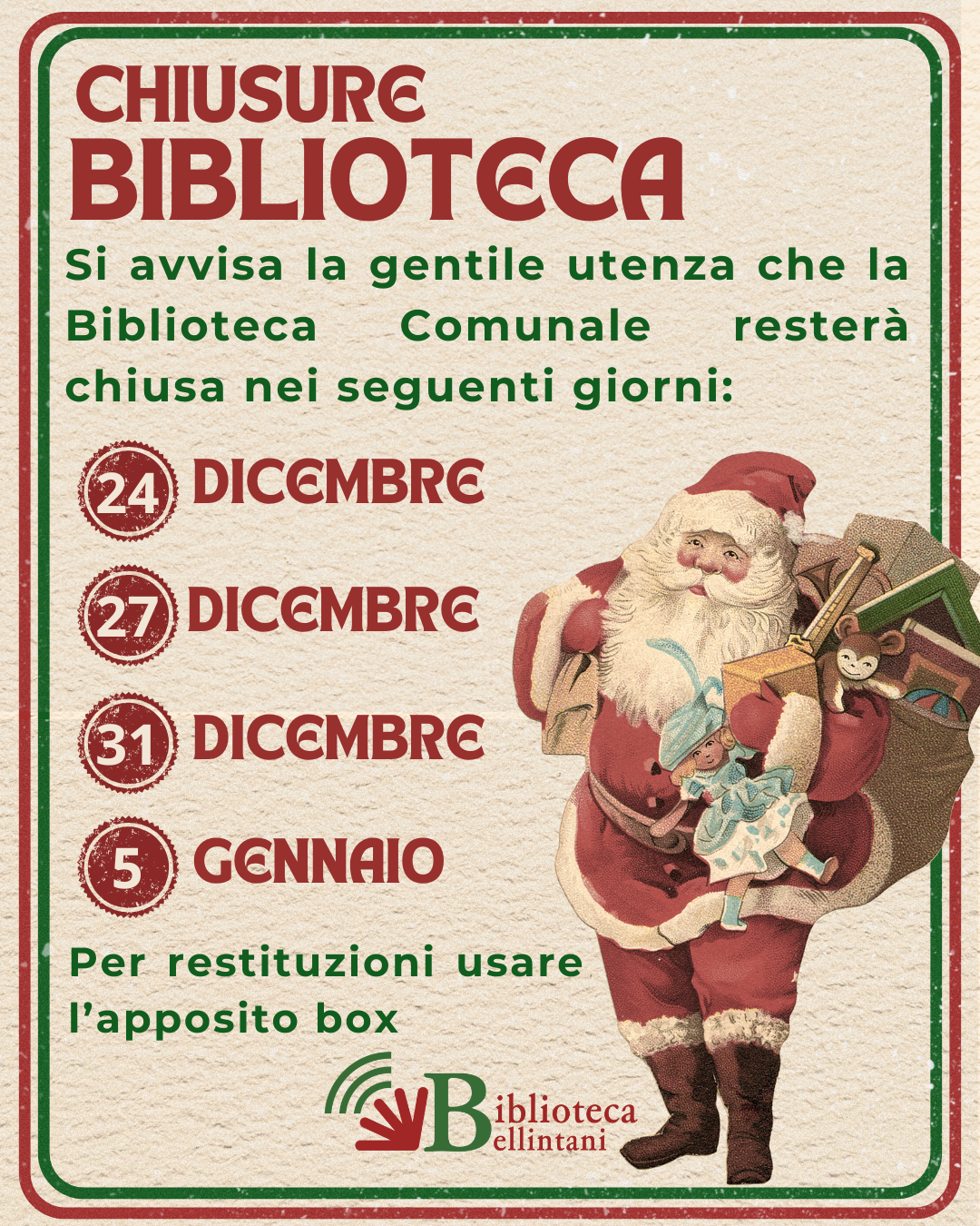 Si avvisa la gentile utenza che la Biblioteca Comunale resterà chiusa nei giorni di: