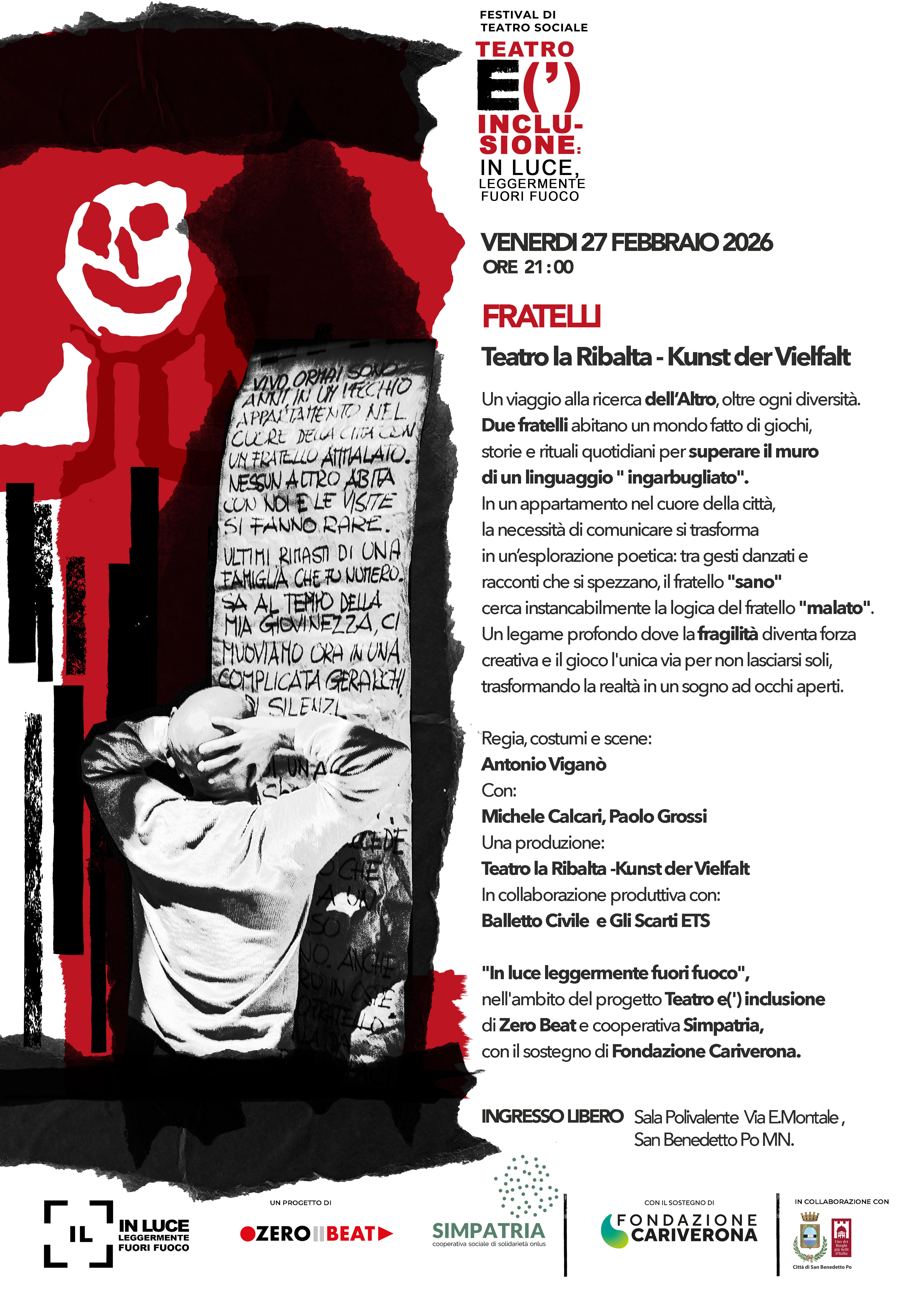 Venerdì 27 febbraio, alle ore 21.00, la Sala Polivalente del Comune di San Benedetto Po ospiterà lo spettacolo Fratelli, una produzione della compagnia Teatro La Ribalta per la regia di Antonio Viganò, già Premio Ubu per l’impegno nel teatro sociale. L’appuntamento si inserisce nella rassegna "In Luce – Leggermente fuori fuoco", un percorso dedicato alle esperienze teatrali che generano inclusione e lavorano sui legami all’interno delle comunità.