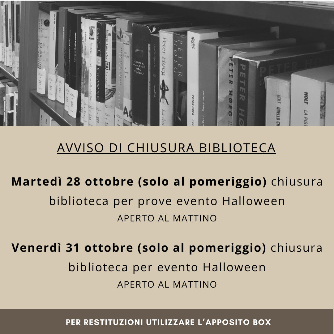 Si avvisa che la Biblioteca resterà chiusa nei pomeriggi di martedì 28 ottobre e di venerdì 31 ottobre.